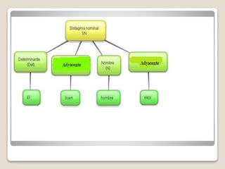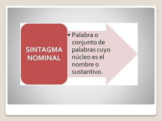 Este documento explica los conceptos de sintagma nominal y sintagma verbal. Define el sintagma nominal como un grupo de palabras centrado en un núcleo sustantivo y el sintagma verbal como el predicado de la oración, centrado en un verbo. Describe las clases, estructuras y complementos típicos de cada uno.