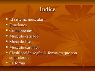 El documento describe los tres tipos de músculos en el cuerpo humano: músculo esquelético, músculo liso y músculo cardíaco. Explica sus funciones, componentes, clasificación y forma. El músculo esquelético controla el movimiento voluntario, el músculo liso controla funciones internas involuntarias y el músculo cardíaco bombea la sangre de forma autónoma.