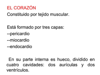 El sistema circulatorio está formado por el corazón, los vasos sanguíneos y la sangre. El corazón bombea la sangre a través de las arterias, vasos capilares y venas para transportar oxígeno, nutrientes y desechos a todas las células del cuerpo a través de un proceso continuo conocido como circulación sanguínea.