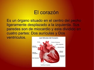 El sistema circulatorio está compuesto por el corazón, la sangre y los vasos sanguíneos, y es responsable de transportar oxígeno por el cuerpo a través de la sangre. El corazón bombea la sangre a través de dos circuitos, el pulmonar y el general, y la sangre contiene glóbulos rojos, blancos y plaquetas que cumplen funciones como el transporte de gases y nutrientes. Las enfermedades relacionadas con la circulación incluyen la leucemia, la anemia y las enfermedades cardiovascul