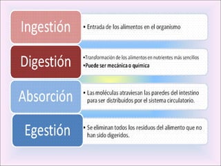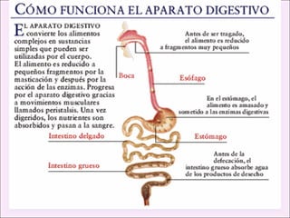El documento describe el sistema digestivo humano. Explica que los alimentos pasan por la boca, esófago, estómago e intestino delgado, donde son digeridos y absorbidos los nutrientes. Luego, los desechos pasan al intestino grueso y son expulsados. Detalla cada parte del tracto digestivo y los procesos de digestión, absorción y egestión. Además, menciona algunas enfermedades comunes como la gastroenteritis y las úlceras.