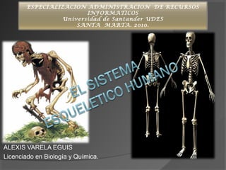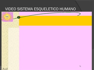 Este documento describe el sistema esquelético humano. Resume que el esqueleto está formado por huesos que se unen para formar una estructura resistente que soporta el cuerpo, protege órganos y permite el movimiento. Describe las partes del esqueleto axial y apendicular, incluyendo los huesos del cráneo, tronco, extremidades superiores e inferiores. También resume los tipos de articulaciones entre los huesos.