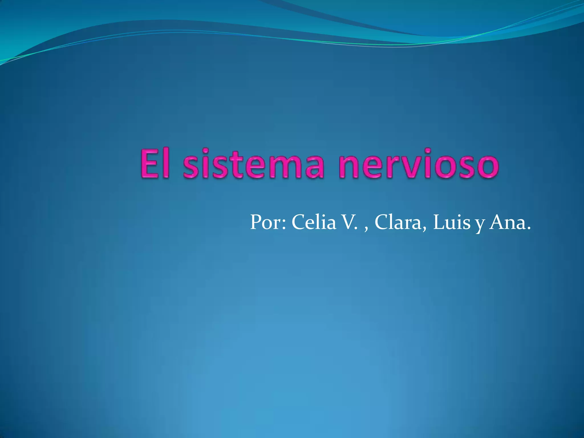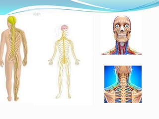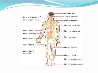 El documento resume el sistema nervioso, incluyendo que recibe información de los sentidos, la procesa y emite una respuesta, y coordina el funcionamiento de los órganos. Describe que está compuesto por un encéfalo central y nervios que llevan órdenes a los órganos, formado por células llamadas neuronas. Explica que la médula espinal pasa por la columna vertebral enviando señales entre el cerebro y el cuerpo, y que el encéfalo está en el cráneo y comprende el prosencéf