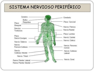 El documento describe el sistema nervioso central. Se compone del cerebro y la médula espinal y coordina la actividad en todo el organismo. Protege el cerebro y la médula espinal a través de las meninges y el líquido cefalorraquídeo. Está formado por la materia gris, que procesa la información, y la materia blanca, que transmite los impulsos nerviosos.