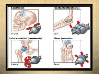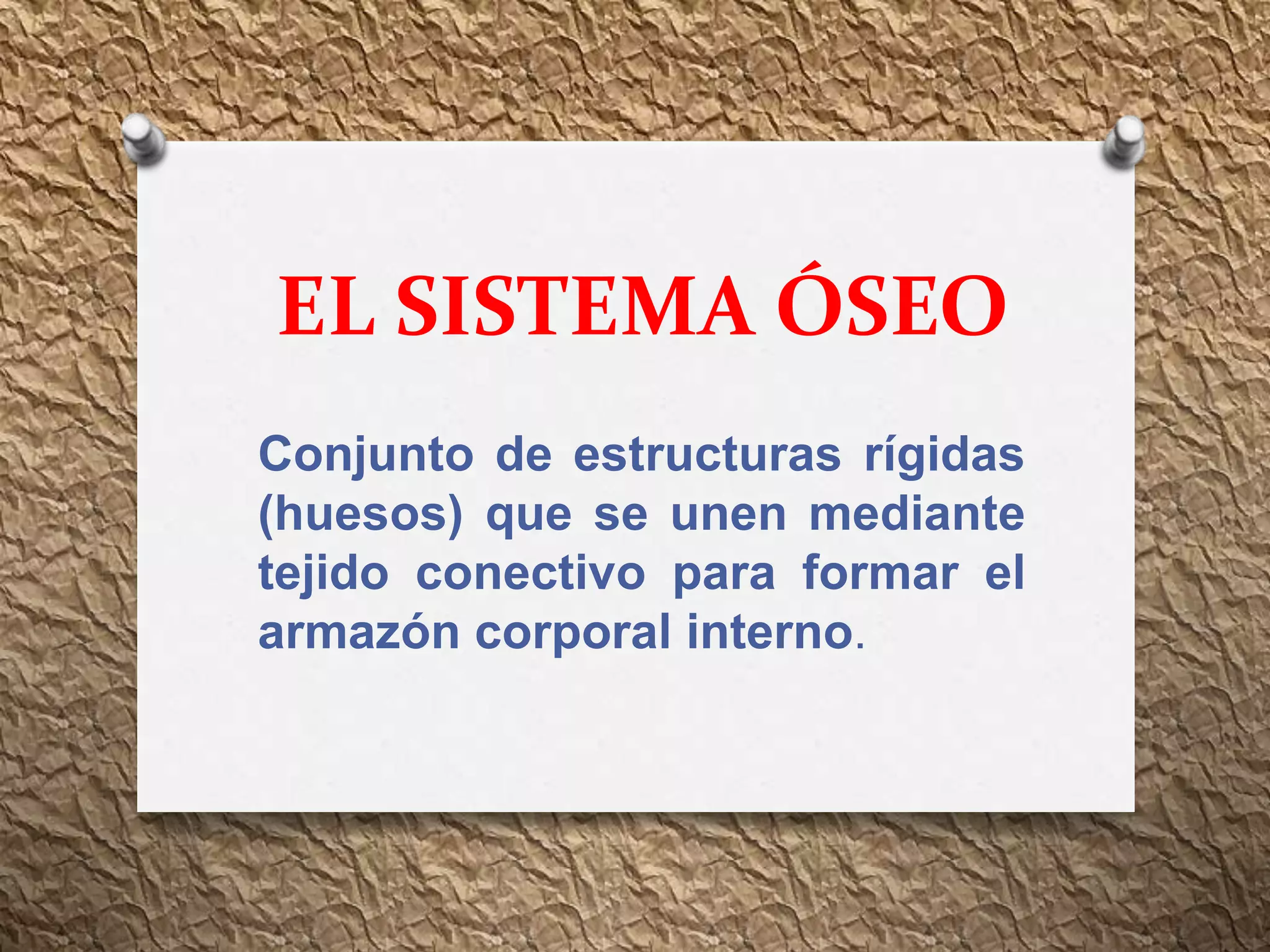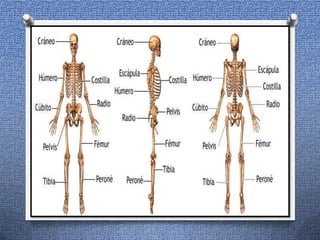 El sistema óseo está formado por los huesos que componen el esqueleto interno y le dan forma al cuerpo. Cumple funciones de sostén, protección, movimiento, almacenamiento de minerales y producción de células sanguíneas. Existen varios tipos de huesos y articulaciones que permiten el movimiento. En total hay 208 huesos que se agrupan en la cabeza, tronco y extremidades.