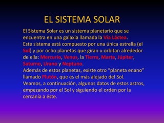 El Sistema Solar está compuesto por el Sol y ocho planetas que orbitan alrededor de él, además de Plutón. Los planetas, ordenados por su cercanía al Sol, son Mercurio, Venus, Tierra, Marte, Júpiter, Saturno, Urano y Neptuno. Cada planeta tiene características únicas en cuanto a su tamaño, composición, atmósfera, lunas y periodo de rotación y revolución.