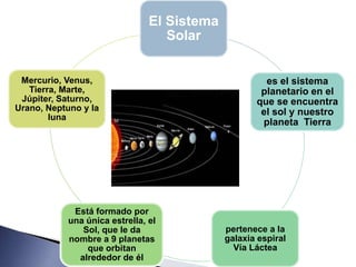 El Sistema Solar está formado por el Sol y nueve planetas que orbitan alrededor de él, incluyendo la Tierra. Se formó hace aproximadamente 4600 millones de años a partir de una nube de gas y polvo. Además de los planetas, contiene planetas enanos, asteroides, cometas y otros cuerpos menores.