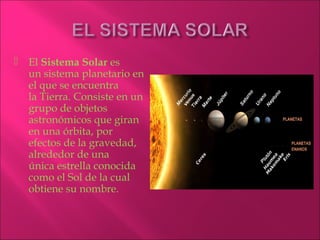 El Sistema Solar consiste en un grupo de objetos astronómicos que giran alrededor del Sol, incluyendo 8 planetas principales como Mercurio, Venus, la Tierra, Marte, Júpiter, Saturno, Urano y Neptuno. Los planetas varían en tamaño, composición y características, desde los pequeños planetas rocosos cercanos al Sol hasta los grandes planetas gaseosos más alejados.
