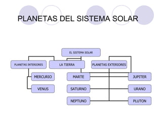 El documento describe los planetas del sistema solar, incluyendo sus características físicas y orbitales principales. Los planetas interiores son Mercurio y Venus, el más cercano al Sol es Mercurio que no tiene atmósfera ni satélites. Venus está cubierto por espesas nubes tóxicas. La Tierra es el único planeta conocido que alberga vida. Los planetas exteriores son más grandes y gaseosos, empezando por Marte y luego Júpiter, Saturno con sus prominentes anillos, Urano y Neptuno. Pl
