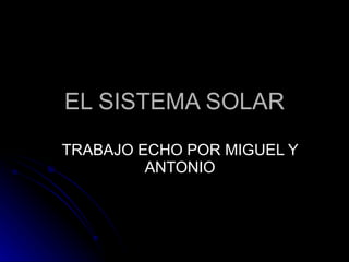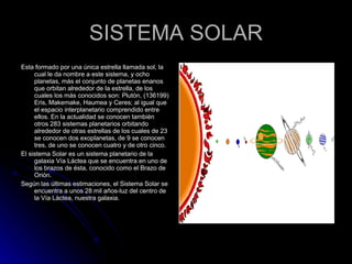 El sistema solar está formado por el Sol y ocho planetas que orbitan alrededor de él, así como planetas enanos como Plutón. Se describen brevemente los características de cada planeta, desde Mercurio, el más cercano al Sol, hasta Neptuno, el más lejano. También se mencionan algunos datos sobre el descubrimiento y composición de los planetas.