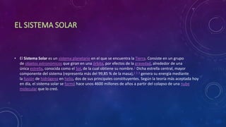 El documento describe los 8 planetas y Plutón que conforman el Sistema Solar. El Sol se encuentra en el centro y genera energía a través de la fusión nuclear. Los planetas interiores son rocosos y más pequeños, mientras que los planetas exteriores son gigantes gaseosos. Cada planeta se describe brevemente mencionando su nombre, posición en el Sistema Solar y características principales.