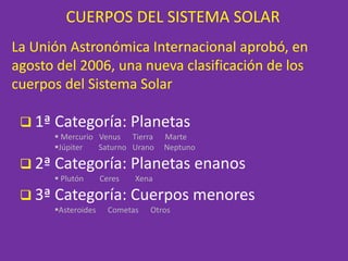 Este documento resume la clasificación y características principales de los cuerpos del sistema solar. Explica que hay tres categorías principales: planetas, planetas enanos y cuerpos menores. Detalla brevemente las características de Mercurio, Marte, Saturno, Neptuno, Urano y la Tierra, incluyendo sus temperaturas, atmósferas y satélites naturales. También incluye una tabla con la distancia y periodo de revolución de los planetas.