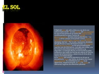 El documento describe los 8 planetas del Sistema Solar. El Sol se encuentra en el centro y proporciona energía a los demás cuerpos. Los planetas interiores son pequeños y rocosos, mientras que los planetas exteriores son enormes y gaseosos. Cada planeta tiene características únicas como tamaño, distancia al Sol y composición atmosférica.
