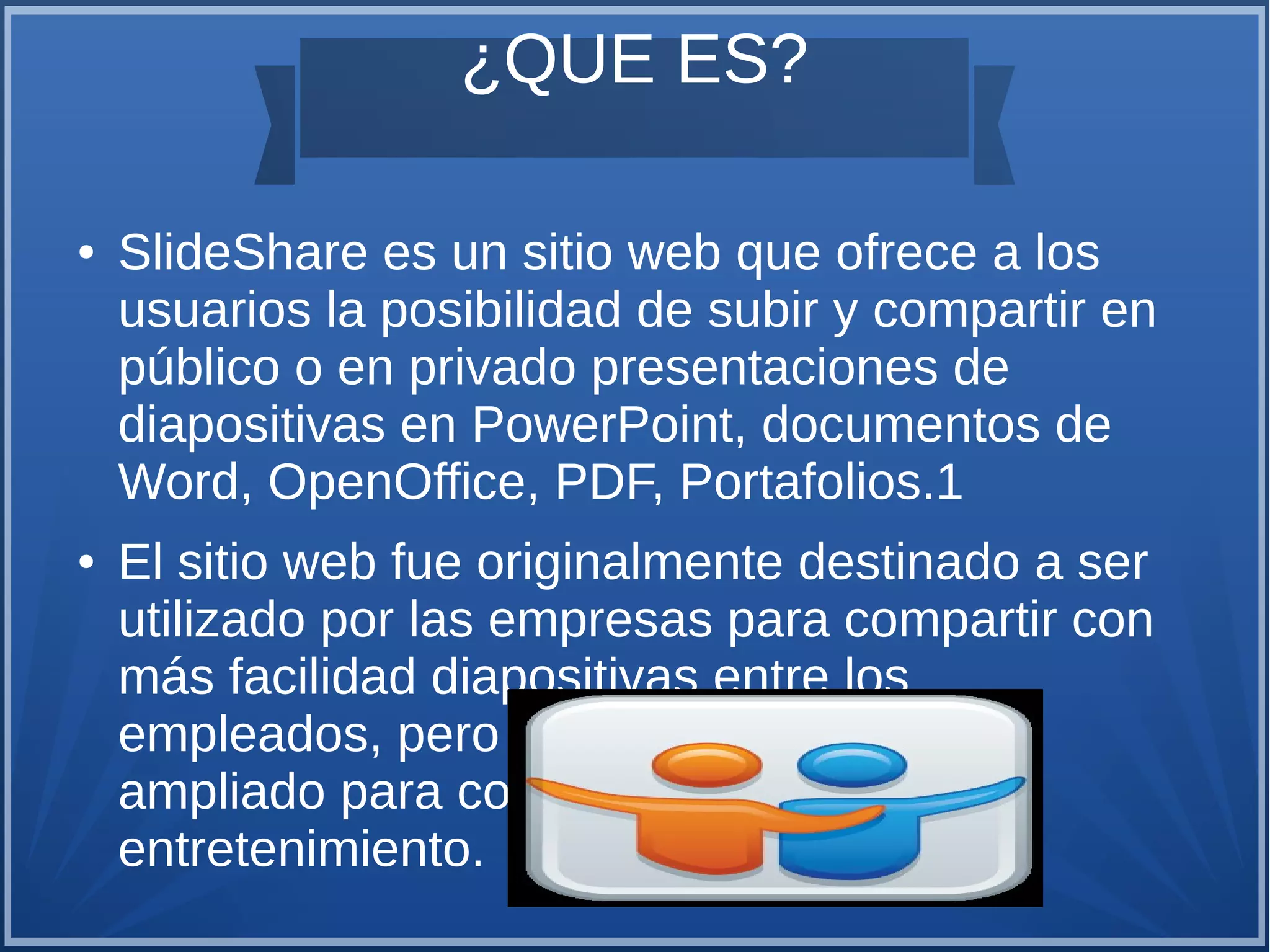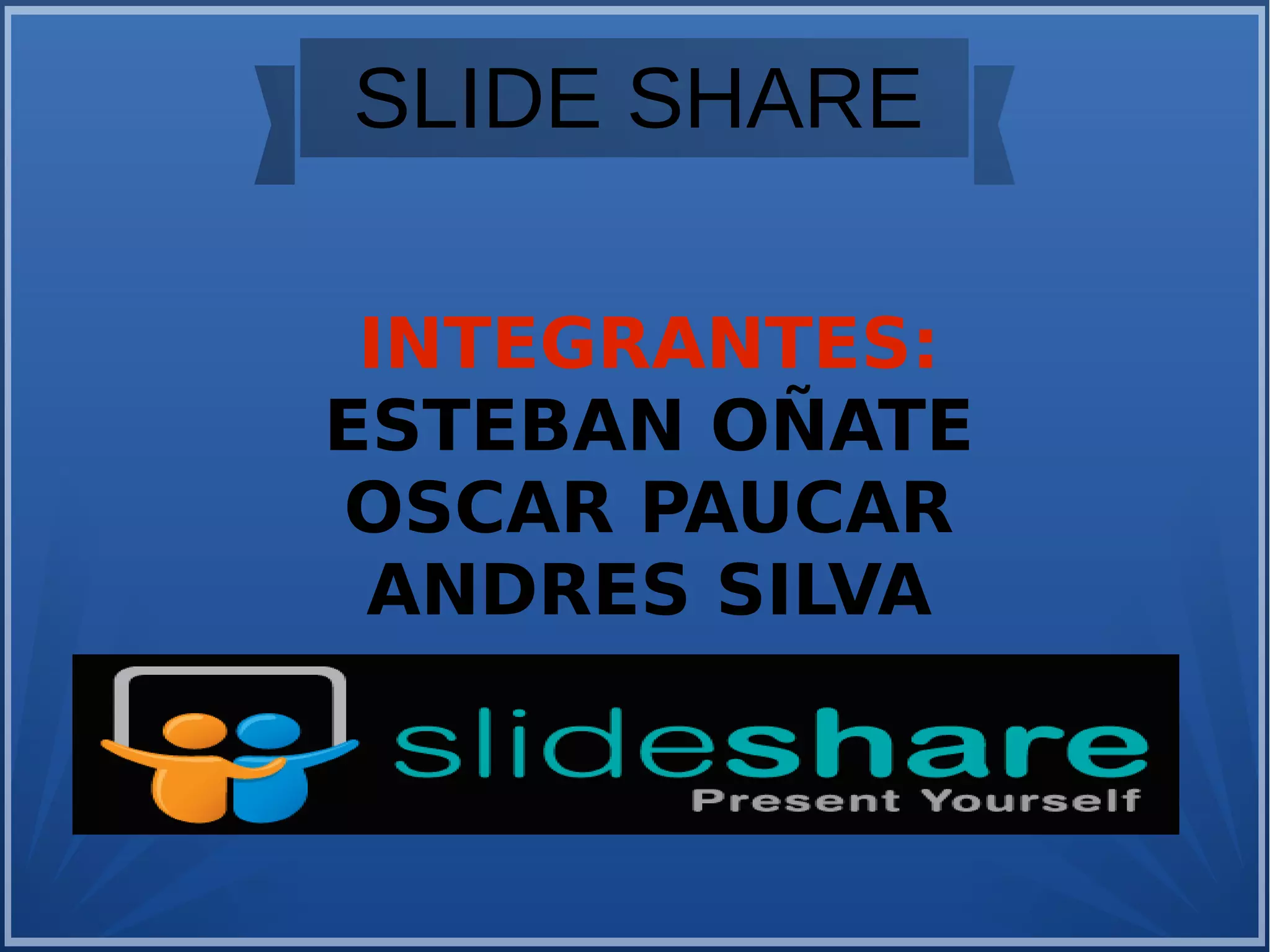 SlideShare es un sitio web que permite a los usuarios subir y compartir presentaciones de diapositivas de forma gratuita. Esteban Oñate, Oscar Pucar y Andrés Silva fundaron SlideShare. El sitio permite a los usuarios subir archivos PowerPoint u OpenOffice y convertirlos a formato Flash para verlos en línea. SlideShare es una opción para compartir presentaciones fácilmente a través de enlaces de URL.