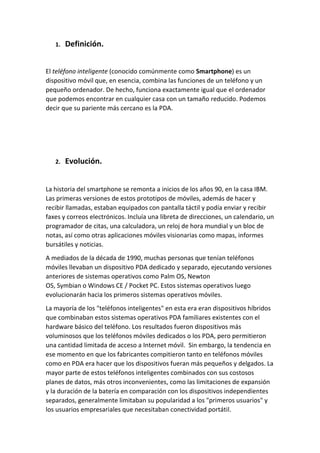 El documento resume la historia y evolución del smartphone desde sus inicios en la década de 1990 hasta la actualidad. Explica que los primeros prototipos de smartphones en IBM ya combinaban funciones de teléfono y computadora personal. En la década de 1990, muchos usaban teléfonos móviles separados de dispositivos PDA. Más tarde, Nokia y Blackberry tuvieron éxito con sus primeros smartphones basados en sistemas operativos como Symbian y Blackberry OS. Todo cambió en 2007 con el lanzamiento del primer iPhone de Apple, que estableció