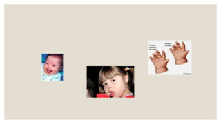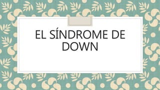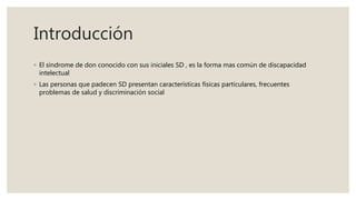 El síndrome de Down (SD) es una discapacidad intelectual causada por la presencia de una copia extra del cromosoma 21. Las personas con SD tienen características físicas particulares como hipotonía y rasgos faciales distintivos, así como retraso mental y posibles problemas de salud. El riesgo de tener un hijo con SD aumenta con la edad materna y si se ha tenido previamente un hijo con esta condición. Los tratamientos para SD incluyen terapias tempranas, ejercicio físico y controles médic
