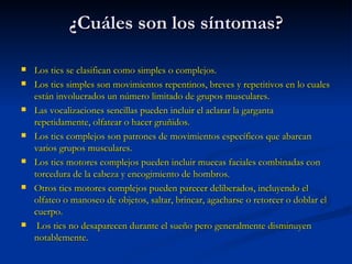 El síndrome de Tourette es un trastorno neurológico caracterizado por movimientos y sonidos repetitivos involuntarios llamados tics que generalmente comienzan en la niñez. Los síntomas varían en tipo, frecuencia y severidad y pueden mejorar en la adultez, aunque la causa es desconocida y se cree que es hereditaria. Afecta más a los hombres que a las mujeres y su pronóstico generalmente no es grave a pesar de ser un trastorno de por vida.