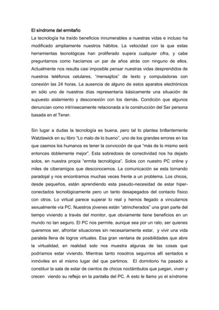 El documento describe el "síndrome del ermitaño", donde el exceso de uso de la tecnología y las redes sociales puede conducir al aislamiento social. La sobredosis de conectividad a través de dispositivos como computadoras y teléfonos celulares ha dejado a las personas solas a pesar de tener miles de amigos en línea. Los jóvenes en particular pasan gran parte de su tiempo encerrados en sus dormitorios interactuando a través de pantallas en lugar de contacto humano físico. Si bien la tecnología tiene