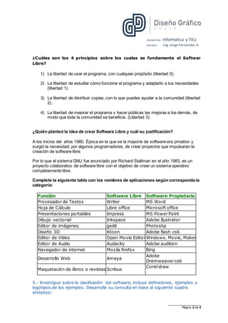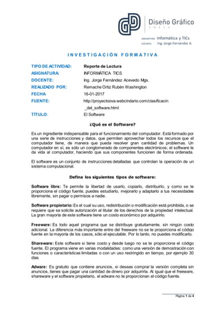 El documento proporciona información sobre diferentes tipos de software. Define software libre, software propietario, freeware, shareware y adware. Explica los cuatro principios fundamentales del software libre y que Richard Stallman propuso la idea de crear software libre en 1983 con el proyecto GNU. Incluye una tabla con ejemplos de aplicaciones de software libre y propietario. Finalmente, presenta una clasificación general del software y ejemplos de diferentes categorías como de sistema, aplicación, herramientas, ofimática y más.