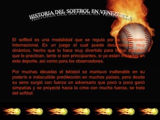 El softbol es un deporte regulado por la Federación Internacional que puede ser muy dinámico y divertido tanto para principiantes como para jugadores experimentados y espectadores. Aunque el béisbol dominó durante décadas, el softbol surgió como un fuerte adversario que ganó popularidad. Si bien ambos deportes comparten elementos estructurales e implementos, difieren en aspectos tácticos como la distancia entre bases y la forma de lanzar. El softbol generalmente dura solo 7 entradas y unas 2 horas.
