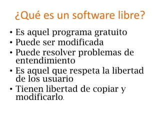 El documento habla sobre el software libre, que es un programa gratuito que puede ser modificado y que respeta la libertad de los usuarios para copiar y modificarlo. Fue creado por Richard Stallman en 1953 para que la gente pudiera acceder y modificar software libremente sin restricciones, en respuesta a software como Windows que no permitía estas libertades. Algunos ejemplos de software libre son programas comúnmente utilizados hoy en día.