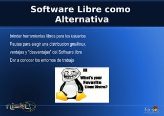 El documento habla sobre el software libre como una alternativa al software propietario. Menciona algunas de las ventajas del software libre como la libertad de usarlo para cualquier propósito, estudiarlo, modificarlo y distribuirlo ya que se tiene acceso al código fuente. También menciona algunas desventajas del software propietario como el pago de licencias, la dependencia de un solo proveedor y la necesidad de actualizar hardware con frecuencia. Luego describe algunas distribuciones de Linux, herramientas de producción libres y capturas de pantalla de