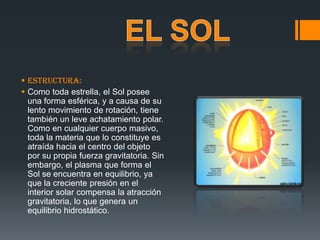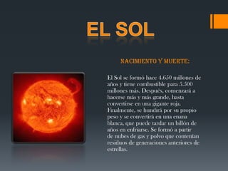 El Sol se formó hace 4.650 millones de años y tiene combustible para otros 5.500 millones de años. Después, comenzará a expandirse y convertirse en una enana blanca en el proceso de morir. El Sol posee una forma esférica debido a su rotación y atracción gravitatoria, pero el plasma interior se mantiene en equilibrio hidrostático gracias a la presión interna. La corona solar, compuesta por las capas más tenues de la atmósfera, alcanza temperaturas de millones de kelvin, mucho más altas que las cap