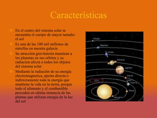 El Sol se encuentra en el centro de nuestro sistema solar y es una de las 100 mil millones de estrellas en nuestra galaxia. Su atracción gravitatoria mantiene a los planetas en órbita y su radiación proporciona toda la energía necesaria para la vida en la Tierra. El Sol está compuesto por cuatro zonas principales y su fotosfera muestra manchas solares, erupciones y gránulos que son visibles desde la Tierra.