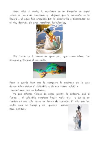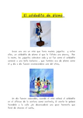 El soldadito de plomo se enamora de una bella bailarina de plomo mientras los juguetes cobraban vida por la noche. Un día son separados cuando el viento tira al soldadito por la ventana a la calle durante una tormenta. Es arrastrado por el agua de la alcantarilla y el río, y termina siendo comido por un pez que es pescado y vendido en el mercado. Por suerte, la cocinera que compra el pez es de la casa donde vivió originalmente el soldadito, por lo que se reencuent