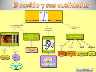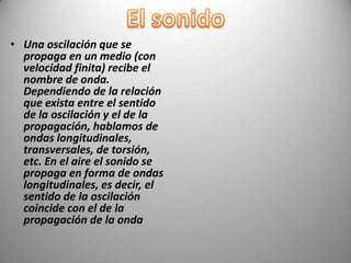 El documento trata sobre la naturaleza del sonido, su propagación como ondas y la acústica, incluida la definición de timbre y amplitud. También aborda el concepto de contaminación acústica, sus causas y efectos negativos en la salud, especialmente entre los jóvenes expuestos a niveles altos de ruido. Se concluye con un ejemplo práctico sobre la medición de la profundidad del agua utilizando la velocidad del sonido.