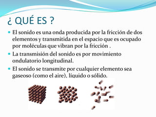 El sonido se produce por la vibración de moléculas transmitidas como ondas longitudinales a través de medios como el aire, agua y metales. La velocidad del sonido varía según el medio y la temperatura, siendo más rápida en el agua y acero que en el aire. El oído capta las vibraciones sonoras y las transmite al cerebro para su interpretación.