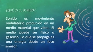 El documento trata sobre el sonido, explicando que es un movimiento ondulatorio producido por la vibración de un medio material o gaseoso. Define el ruido como un conjunto de sonidos no coordinados y desagradables. Explica que el sonido se propaga a través de ondas en un medio y que el sonido digital codifica señales sonoras analógicas en términos numéricos discretos. Finalmente, describe brevemente el proceso de audición y cómo los recursos sonoros permiten la elaboración de mensajes y comunicación a través de son