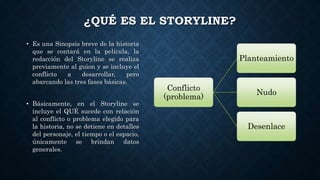 El storyline es una sinopsis breve de la historia que se contará en la película. Se redacta previamente al guion e incluye el conflicto a desarrollar abarcando las tres fases básicas: planteamiento, nudo y desenlace. En el storyline se describe qué sucede con relación al conflicto elegido para la historia de manera general sin entrar en detalles de personajes, tiempo o espacio.