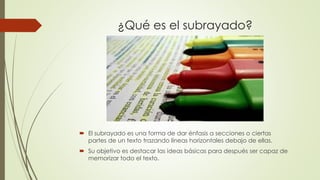 El documento explica la técnica del subrayado como una herramienta para destacar las ideas principales y palabras clave de un texto. El subrayado tiene como objetivos apoyar la lectura analítica, servir de base para la síntesis y ayudar a la memorización. Se recomienda subrayar de forma selectiva para focalizar la atención en lo más relevante y evitar el subrayado excesivo.