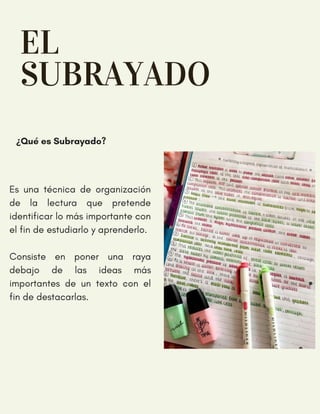 El documento explica las técnicas de subrayado y resumen como herramientas para organizar la lectura y destacar la información más importante. El subrayado consiste en marcar con una línea las ideas clave de un texto para estudiarlas y aprenderlas mejor. También habla sobre las ventajas de estas técnicas como facilitar la comprensión, estructuración de ideas y el repaso.