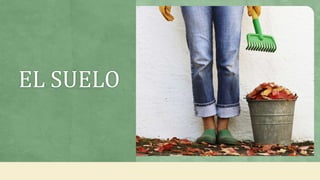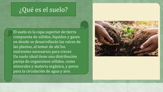 El suelo es la capa superior de tierra donde crecen las plantas, compuesto de sólidos, líquidos y gases, con propiedades físicas como color, textura y estructura que determinan su aptitud para la siembra. Sus propiedades químicas, incluyendo pH y fertilidad, afectan la disponibilidad de nutrientes esenciales para el crecimiento vegetal. El suelo se compone de tres capas: superior, intermedia e inferior, cada una con características distintas que influyen en su composición y función.