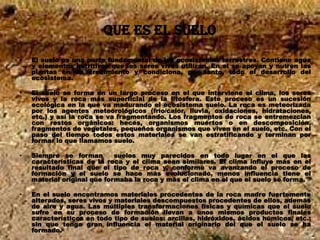 El suelo es esencial para los ecosistemas terrestres, ya que proporciona agua y nutrientes a las plantas y se forma a través de un proceso de meteorización de rocas, donde influyen el clima y la vida orgánica. Se clasifica según su funcionalidad y características físicas, con tipos como suelos arenosos, humíferos y arcillosos, cada uno con propiedades específicas que determinan su utilidad agrícola. La formación del suelo resulta de procesos físicos, químicos y biológicos, y su evolución está condicionada por factores como el clima, la topografía y el tiempo.