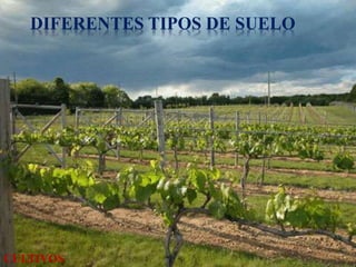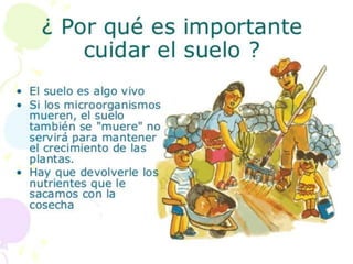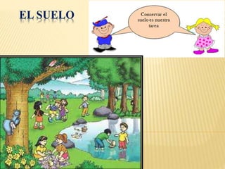 El documento habla sobre los diferentes tipos de suelo y cómo se forma. Explica que el suelo se compone de capas y provee un hábitat para las plantas y animales. También destaca la importancia de conservar el suelo protegiendo la vegetación para prevenir la erosión y desertización.