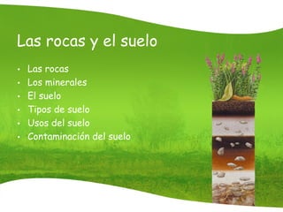 Este documento describe las rocas, minerales y suelo. Las rocas se forman por uno o más minerales y se encuentran en todas partes. Los minerales se encuentran solos o formando parte de las rocas y tienen propiedades únicas como forma, color y dureza. El suelo está formado por capas que contienen arena, arcilla y piedras y se usa para agricultura, jardinería y construcción. Sin embargo, la contaminación del suelo debido a la acción humana como la erosión y el uso incorrecto de fertilizantes es un problema.