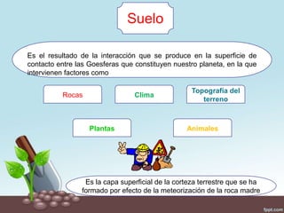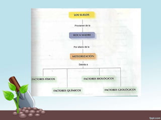 Este documento describe las características del suelo, incluyendo su color, pH, y perfil. Explica que el suelo se forma a través de la interacción de factores como rocas, clima, topografía, plantas y animales. También describe los procesos de formación del suelo como la meteorización, adición, translocación y lixiviación.