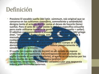 Este documento define el sueño y describe los patrones de sueño típicos en diferentes etapas de la vida, incluyendo bebés, niños preescolares, escolares, adolescentes y adultos. Explica que la cantidad de sueño necesaria varía según la edad, pero que la falta de sueño puede afectar el comportamiento y el rendimiento.