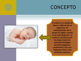 El documento describe el sueño y sus diferentes etapas. Resume que el sueño es un estado de reposo fisiológico caracterizado por bajos niveles de actividad y menor respuesta a estímulos externos. Explica las cinco etapas del sueño - etapas 1 a 4 de sueño ligero a profundo y la etapa REM de sueño activo y sueños. También cubre temas como la importancia del sueño, consejos para dormir mejor, áreas cerebrales involucradas y trastornos del sueño como la privación y el sonambulismo