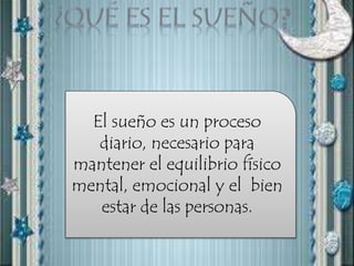 El sueño es un proceso diario necesario para mantener el equilibrio físico, mental y emocional. La cantidad de horas de sueño necesarias varía según la edad, desde 16-20 horas para bebés recién nacidos hasta 14 horas para bebés de 6 meses. El ciclo de sueño de los adultos dura entre 90-100 minutos, mientras que en los bebés es de unos 47 minutos. Dormir a horas irregulares o muy tarde se ha asociado con más problemas de conducta en los niños.