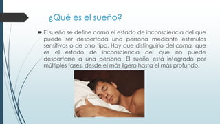El documento describe las diferentes fases del sueño, incluyendo las fases NO REM y REM. Explica que el sueño es necesario para que el cuerpo y la mente descansen y que la privación del sueño puede tener efectos negativos en el estado de ánimo, el rendimiento y el sistema inmunológico. También proporciona consejos sobre cómo mejorar la calidad del sueño, como hacer ejercicio, limitar las siestas y mantener una rutina consistente para acostarse.