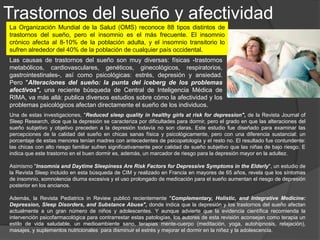 El documento resume los principales conceptos relacionados con el sueño. Explica que el sueño es un estado de reposo caracterizado por bajos niveles de actividad fisiológica y menor respuesta a estímulos externos. Se divide en sueño No-MOR y MOR, los cuales se diferencian por parámetros como los movimientos oculares y la actividad cerebral. También describe el ritmo circadiano y factores como la edad que afectan la cantidad de sueño necesaria.