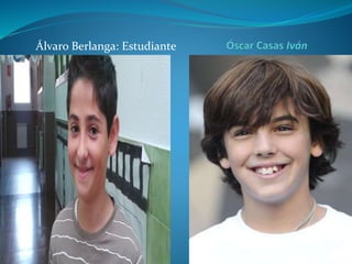 El documento lista los nombres de varias personas y sus roles, incluyendo estudiantes como Álvaro Berlanga, Nerea Gerrero y Alejandro Michelena, y roles en una película como Antonio Resines como El Abuelo, y Demián Bichir como Entrenador torres.