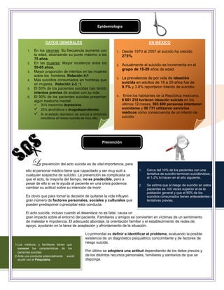 2) En México, el suicidio es la segunda causa de muerte entre jóvenes después de accidentes de tránsito, siendo conflictos amorosos y familiares las principales causas.