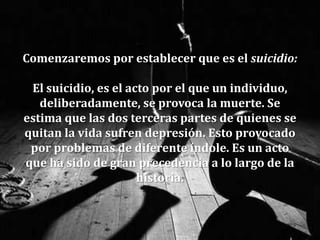 El documento resume las principales teorías sobre el suicidio. Explica que el suicidio es un acto deliberado que causa la propia muerte y que generalmente está relacionado con la depresión o trastornos psiquiátricos. Además, discute las cuatro categorías de suicidio propuestas por Durkheim y rechaza la idea de que el suicidio se deba a la locura. Finalmente, concluye que las verdaderas causas del suicidio son factores sociales que varían entre grupos y sociedades.