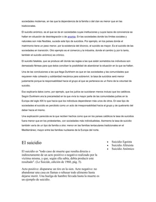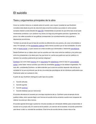 Durkheim analiza las tasas de suicidio en varios países europeos y observa que varían según el tipo de sociedad. Identifica cuatro tipos de suicidio: egoísta, altruista, anómico y fatalista. Explica que el suicidio es un hecho social causado por fuerzas sociales como la integración familiar y religiosa, no por causas individuales. Las sociedades modernas tienen más suicidio anómico debido a la desintegración social y debilidad de los lazos comunitarios.