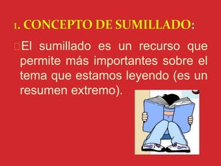 Este documento describe el sumillado y el cuadro sinóptico como métodos para resumir textos. El sumillado permite resaltar las ideas más importantes de un texto de manera breve. Se realiza subrayando o resaltando las ideas clave y colocándolas al margen del texto. El cuadro sinóptico es un esquema que recoge de manera jerárquica y ordenada las ideas principales y secundarias de un tema seleccionadas a partir de un sumillado o lectura. Ambos métodos son útiles para estudiar de manera